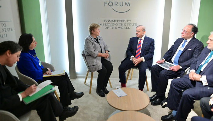 ڈیووس: (ویب ڈیسک)وزیراعظم کی آئی ایم ایف کے ایم ڈی کرسٹالینا جارجیوا سے ملاقات وزیراعظم محمد شہبازشریف نے عالمی اقتصادی فورم کے 56ویں سالانہ اجلاس کے موقع پر آج سوئٹزرلینڈ کے شہر ڈیووس میں انٹرنیشنل مانیٹری فنڈ کی منیجنگ ڈائریکٹر کرسٹالینا جارجیوا سے ملاقات کی۔ وزیراعظم نے منیجنگ ڈائریکٹر کو پاکستان کے میکرو اکنامک اشاریوں میں بہتری، استحکام کی کوششوں اور ادارہ جاتی اصلاحات پر پیش رفت سے آگاہ کیا۔ انہوں نے مالیاتی نظم و ضبط، محصولات کو متحرک کرنے اور پائیدار ترقی کے لیے پاکستان کے عزم پر زور دیا۔ ایم ڈی آئی ایم ایف نے پاکستان کی اصلاحاتی کوششوں کا اعتراف کیا اور ان کوششوں کی تعریف کی ۔ انہوں نے طویل مدتی اقتصادی لچک کو یقینی بنانے کے لیے اصلاحات کی رفتار کو برقرار رکھنے کی اہمیت پر زور دیا۔ دونوں فریقین نے عالمی اقتصادی نقطہ نظر، ابھرتی ہوئی معیشتوں کو درپیش چیلنجز اور اقتصادی استحکام کے تحفظ میں کثیرالجہتی تعاون کی اہمیت پر تبادلہء خیال کیا۔ملاقات میں نائب وزیراعظم و وزیر خارجہ اسحاق ڈار ، وفاقی وزیر اقتصادی امور احد خان چیمہ ، وفاقی وزیر خزانہ و محصولات محمد اورنگزیب اور وفاقی وزیر اطلاعات و نشریات عطاء اللہ تارڑ بھی موجود تھے۔