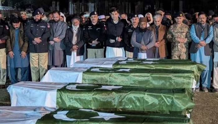 شہدا کی نمازِ جنازہ اعجاز شہید پولیس لائن میں ادا کی گئی، شہدا کے جسد خاکی کو گارڈ آف آنر پیش کیا گیا، نماز جنازہ میں عسکری، پولیس افسران، سول سوسائٹی، سیاسی و سماجی شخصیات سمیت رشتے داروں نے شرکت کی، نمازِ جنازہ کے بعد شہدا کے جسد خاکی آبائی علاقوں کو روانہ کر دیے گئے۔