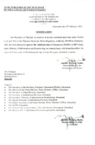 اسلام آباد(صغیر چوہدری )مس عنبرین جان پاکستان الیکٹرنک میڈیا ریگو لیٹری اتھارٹی پیمرا کی پہلی خاتون چئیرپرسن تعینات ہوگئیں صدر مملکت آصف زرداری کی منظوری کے بعد اسٹیبلشمنٹ ڈویژن نے تقرری کے لئے باقاعدہ نوٹیفیکیش جاری کردیا ۔۔ وزیراعظم شہبازشریف نے سابق سیکریٹری اطلاعات عنبرین جان کی تقرری کی سمری منظوری کیلئے صدر مملکت کو ارسال کی تھی جسے صدر آصف علی زرداری نے دوروز قبل منظور کرلیا تھا ۔واضح رہے کہ پارلیمانی کمیٹی نے عنبرین جان کی بطور چیئرپرسن پیمرا تقرری کی سفارش کی تھی جس پر وزیراعظم نے سفارش صدر مملکت کو ارسال کی اور صدر آصف علی زرداری نے انکی تقرری کی منظوری تھی ۔سابق چئیرمین سلیم بیگ کی اکتوبر کو مدت ملازمت ختم ہونے کے بعد پیمرا کے سربراہ کا عہدہ کئی ماہ سے خالی تھا جس سے پیمرا کے روزمرہ امور متاثر ہورہے تھے اور ایگزیکٹو ممبر پیمرا روزمرہ امور انجام دے رہے تھے ۔عنبرین جان انفارمیشن سروس گروپ کی سینئر افسر ہیں انہوں نے 1990 میں انفارمیشن گروپ کو جوائن کیا اور وزارتِ اطلاعات و نشریات میں سیکرٹری کے عہدے پر خدمات سر انجام دیں۔