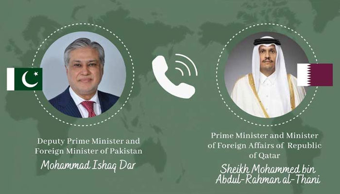 ترجمان دفتر خارجہ کے مطابق اسحاق ڈار نے قطر کے وزیراعظم و وزیر خارجہ سے ٹیلیفونک گفتگو کے دوران خطے سمیت اور عالمی صورتحال پر تبادلہ خیال کیا۔