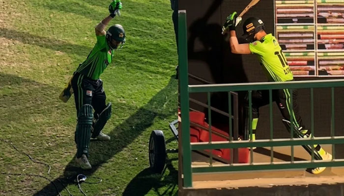 ویڈیو میں دیکھا جاسکتا ہے کہ انہوں نے پہلے بلے کو سائیڈ اسکرین کے ٹائر پر مارا پھر سیڑھیاں چڑھتے ہوئے بلے کو زور سے زمین پر مارا اور اندر چلے گئے۔