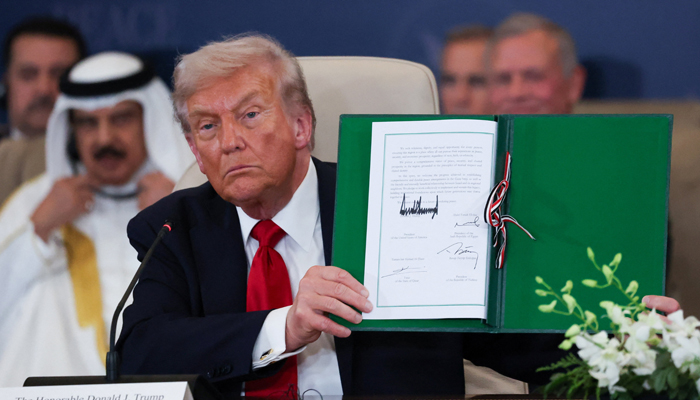 شرم الشیخ: امریکی صدر ڈونلڈ ٹرمپ، مصری صدر عبدالفتاح السیسی، ترک صدر رجب طیب اردوان اور قطر کے امیر شیخ تمیم بن حمد آل ثانی نے غزہ امن معاہدے پر دستخط کر دیے۔ یہ معاہدہ، جو ٹرمپ کے 20 نکاتی امن پلان کی بنیاد پر تیار کیا گیا، دو سالہ خونریز جنگ کا خاتمہ کرتے ہوئے یرغمالیوں کی رہائی، اسرائیلی افواج کے انخلا اور غزہ کی تعمیر نو کی راہ ہموار کرے گا۔