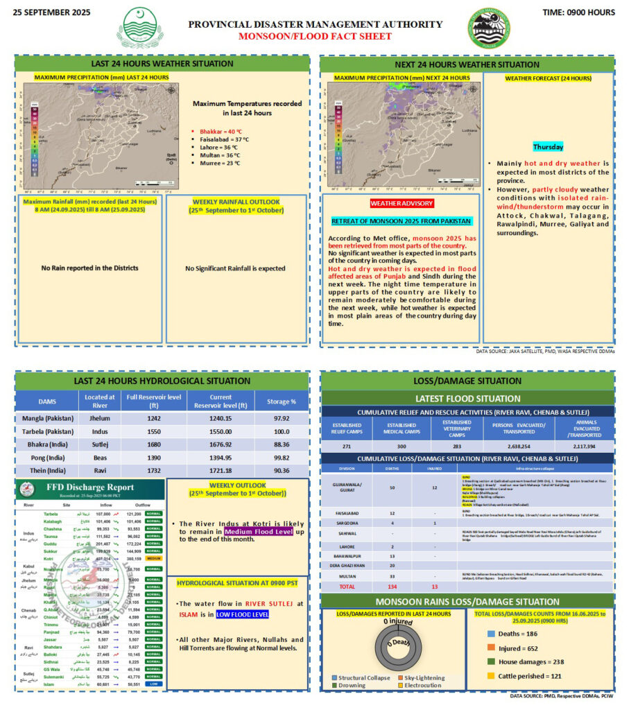 دریائے راوی ستلج اورچناب میں سیلاب سے نقصانات کی رپورٹ جاری کر دی گئی ،پنجاب کے 27اضلاع سیلاب سے متاثر ہوئے،سیلاب کے باعث 4700سے زائددیہات متاثر ہوئے ہیں-ریلیف کمشنرپنجاب کی جانب سے جاری کی گئی رپورٹ میں بتایا گیا ہے ،دریاؤں میں سیلابی صورتحال کے باعث مجموعی طورپر 47لاکھ 60ہزارلوگ متاثر ہوئے ہیں، 271ریلیف کیمپوں۔۔۔